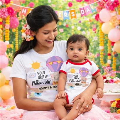 first Mother’s Day combo set India, mom and baby matching outfits, Our First Mother’s Day t-shirt set, personalized mom baby outfit, baby romper Mother’s Day India, custom mom and baby clothes, newborn Mother’s Day gift ideas, baby photoshoot matching outfit, cotton mom baby combo set, baby clothing online India, mom and baby twinning outfit India, personalized baby romper with name, comfortable mom and baby clothing, first Mother’s Day gift for new mom, baby fashion India