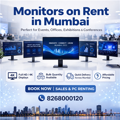Get high-quality LED/LCD monitors on rent for events, offices, exhibitions, and training sessions. Flexible rental plans with quick delivery, setup support, and bulk availability across Mumbai. Ideal for short-term and long-term business needs.