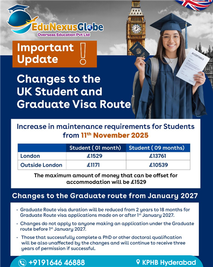 The United Kingdom has recently announced significant updates to its Student and Graduate Visa Route, which will take effect from 11th November 2025 and 1st January 2027. These changes are crucial for all students planning to study in the UK, as they impact both the financial requirements for visa applications and the duration of post-study work opportunities. EduNexus Globe is here to help students understand these changes and guide them through every step of the updated process with clarity and confidence.