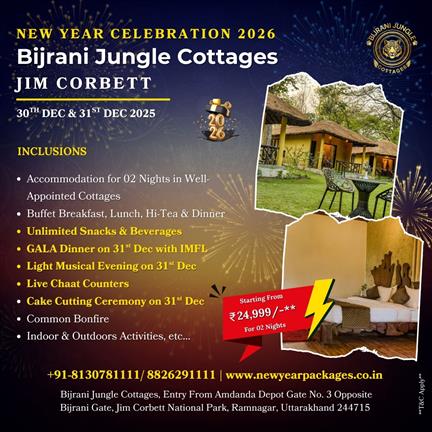 Looking for peaceful and exciting new year packages in Jim Corbett? Bijrani Jungle Cottages offers a perfect blend of nature, comfort, and celebration for New Year 2026. Planned by CYJ – Comfort Your Journey, these packages include a comfortable jungle stay, DJ night, gala dinner, bonfire, and festive New Year Eve celebrations. Jim Corbett is one of the most popular destinations for New Year due to its scenic beauty and calm environment. Staying near the Bijrani zone makes the experience even more special for nature lovers. These packages are ideal for families, couples, and friends who want a refreshing start to the New Year. CYJ manages everything professionally, ensuring a smooth and enjoyable holiday experience. Limited availability during peak dates makes early booking important.