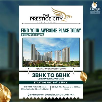 Welcome to the world of luxury! We offer you a luxurious project called Prestige City in Indirapuram Extension, NH24, Delhi NCR, which offers 3 BHK apartments and other options including 4/5/6BHK apartments/penthouses/duplexes in Indirapuram Extension. Prestige City is being designed and developed by the world-renowned L&T Realty. The designed floor plans range in size from 1870 to 6026 square feet. This project is very close to Noida Sector 62/63 and is located along NH09/24 and Delhi-Meerut Expressway NE03. Buy a valuable home today at a starting price of only ₹2.35 crore*! read for more information Visit to WWW.propshop.org.in/the-prestige-city