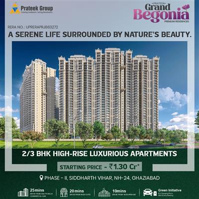 Want luxury in the soothing environment of nature? Come to Prateek Grand Begonia Phase 2, Siddharth Vihar, where there are various ultra-modern elements of life waiting for you and your family. Prateek Grand Begonia 2/3 bhk apartment can be reached using roads, airports, the Delhi Metro, and the riverway. The 2 BHK apartment in Siddharth Vihar Ghaziabad, has great proximity to Sector 62/63, Noida, which will benefit the residents in getting exposure to the world’s finest amenities. Prateek Grand Begonia Siddharth Vihar offers 2/3 bhk apartments packed with trendy luxuries. Prateek Grand Begonia can be your best choice in Delhi NCR, only at 1.30 Cr*! read for more inFormation Visit to www.propshop.org.in/prateek-grand-begonia