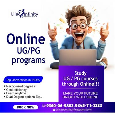 Lilac Infinity offer Study UG / PG courses through Online!!! MAKE YOUR FUTURE BRIGHT WITH ONLINE. Top Universities in INDIA. Recognised degrees | Cost efficiency | Learn anytime | Dual Degree options Etc., For more Details Contact us: 9360069802
