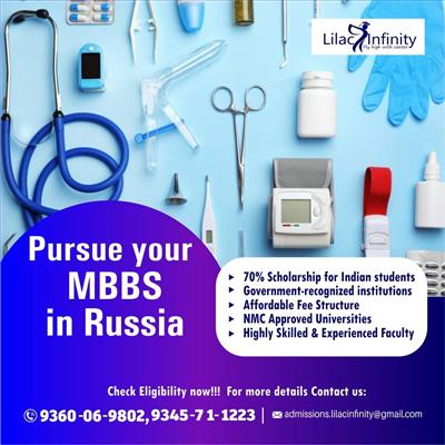 "For aspiring doctors seeking quality education beyond borders, Lilac Infinity offers Study MBBS in Russia a pathway to a world-class medical education is accessible and affordable. Studying MBBS in Russia is an increasingly popular option for international students, especially from India, due to its blend of affordability, quality education. Lilac Infinity is trained leading overseas education admission office that empowers aspiring medical students to study MBBS at Russia’s most reputed institutions, including Crimea State Medical University and Kursk State Medical University. These universities offer English-medium programs accredited by WHO , UNESCO and other international organizations.Russian medical universities blends strong theoretical foundations with hands-on clinical training, preparing international students for real-world medical practice. The major advantage of study MBBS in Russia is the cost-effective fee structure and low living expenses compared to many Western countries. Our young expert counselors' guidance makes the admission process smooth and hassle-free. Known for its strong legacy in healthcare education and the Healthcare Placement Program, Universities in Russia are equipped with modern laboratories and advanced medical facilities, ensuring real-time medical practice and scholarship opportunities for eligible international students. With Lilac Infinity Study MBBS in Russia, guiding the complete MBBS journey and becoming a secure and rewarding path for aspiring doctors and with years of expertise in placing thousands of students into Russian medical universities, Lilac Infinity is a trained leading overseas education admission office, has become a trusted partner in guiding future doctors toward successful international medical careers. Our young expert counsellors are helping you choose the right university and navigate every stage—from application to arrival.