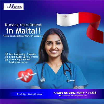 "Malta is emerging as one of the most attractive, realistic options for internationally trained nurses and the name Malta stems from the Greek word meaning “place of honey,” lives up to its charming title in more ways than one. A trip to Malta is a journey into a land where nature, culture, and career opportunities intertwine seamlessly.For nursing professionals, Lilac Infinity Nursing Recruitment program to Malta offers a unique and rewarding pathway to work as a registered nurse through its structured Healthcare Placement Programs in Malta. Lilac Infinity is a trained leading Overseas Education Admission Office that also offers a wide range of Diploma programs for skilled workers who want to secure jobs in Malta with attractive salaries and strong career growth in diverse fields, including healthcare, hospitality, IT, and more. For nurses looking to advance their careers, Malta provides an excellent opportunity through the Lilac Infinity Nursing Placement Program, which is specifically designed for skilled nurses who wish to work and settle in Malta as registered nurses. Through our Nursing Placement Program in Malta, students can also explore job opportunities across 27 Schengen countries in Europe. With a smooth visa process and guidance from our young expert counsellors, students receive step-by-step guidance from selecting the right program to completing applications and settling in Malta, ensuring a seamless transition to successful international career opportunities. Nursing Placement Program in Malta welcomes nurses up to the age of 35, with processing completed within just 3 months and a direct pathway to settle as a registered nurse. Lilac Infinity Kollam offers an ideal pathway for young professionals and skilled nurses seeking international exposure and you gain access to a world-class Nursing Placement Program, and a clear pathway to permanent residency in Europe. To Know More