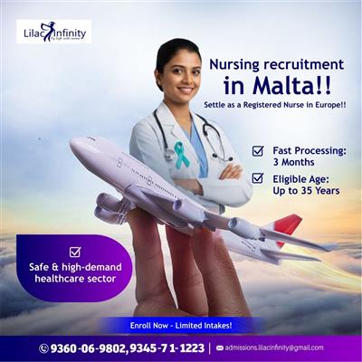 "Malta is emerging as one of the most attractive, realistic options for internationally trained nurses and the name Malta stems from the Greek word meaning “place of honey,” lives up to its charming title in more ways than one. A trip to Malta is a journey into a land where nature, culture, and career opportunities intertwine seamlessly.For nursing professionals, Lilac Infinity Nursing Recruitment program to Malta offers a unique and rewarding pathway to work as a registered nurse through its structured Healthcare Placement Programs in Malta. Lilac Infinity is a trained leading Overseas Education Admission Office that also offers a wide range of Diploma programs for skilled workers who want to secure jobs in Malta with attractive salaries and strong career growth in diverse fields, including healthcare, hospitality, IT, and more. For nurses looking to advance their careers, Malta provides an excellent opportunity through the Lilac Infinity Nursing Placement Program, which is specifically designed for skilled nurses who wish to work and settle in Malta as registered nurses. Through our Nursing Placement Program in Malta, students can also explore job opportunities across 27 Schengen countries in Europe. With a smooth visa process and guidance from our young expert counsellors, students receive step-by-step guidance from selecting the right program to completing applications and settling in Malta, ensuring a seamless transition to successful international career opportunities. Nursing Placement Program in Malta welcomes nurses up to the age of 35, with processing completed within just 3 months and a direct pathway to settle as a registered nurse. Lilac Infinity Kollam offers an ideal pathway for young professionals and skilled nurses seeking international exposure and you gain access to a world-class Nursing Placement Program, and a clear pathway to permanent residency in Europe. To Know More