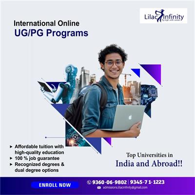 Whether you are a student or a working professional, Lilac Infinity International online UG PG Program helps you achieve academic excellence with complete flexibility. Enroll in internationally recognized online undergraduate and postgraduate programs through Lilac Infinity is a trained leading overseas admission office. Students who wish to begin their academic journey can choose from popular online UG programs such as Bachelor of Business Administration (BBA) for management and entrepreneurship, Bachelor of Computer Applications (BCA) for IT, software development, and computer science foundations, Bachelor of Science (BSc) such as information technology, data science, mathematics Bachelor of Arts (BA) and more. These undergraduate programs offer a strong academic foundation, practical knowledge, and international exposure, making them ideal for students seeking online study opportunities, thereby ensuring global career prospects. By choosing the Lilac Infinity Online UG PG program, students can confidently study online courses that are flexible, affordable, and aligned with global academic standards, making Lilac Infinity Kollam a preferred choice for modern learners. At the postgraduate level, Lilac Infinity is a trained leading overseas admission office that supports graduates and working professionals who wish to advance their careers, offering PG courses such as Master of Business Administration (MBA), Master of Science (MSc), Master of Computer Applications (MCA), along with specialized PG diplomas and certification programs. These online PG programs focus on advanced learning and industry-relevant skills, helping learners gain internationally valued qualifications while continuing their work or business activities. Lilac Infinity delivers flexible and accessible learning at both undergraduate and postgraduate levels, enabling students to attend online classes, access digital resources, and receive academic support without worrying about travel costs or relocation challenges.