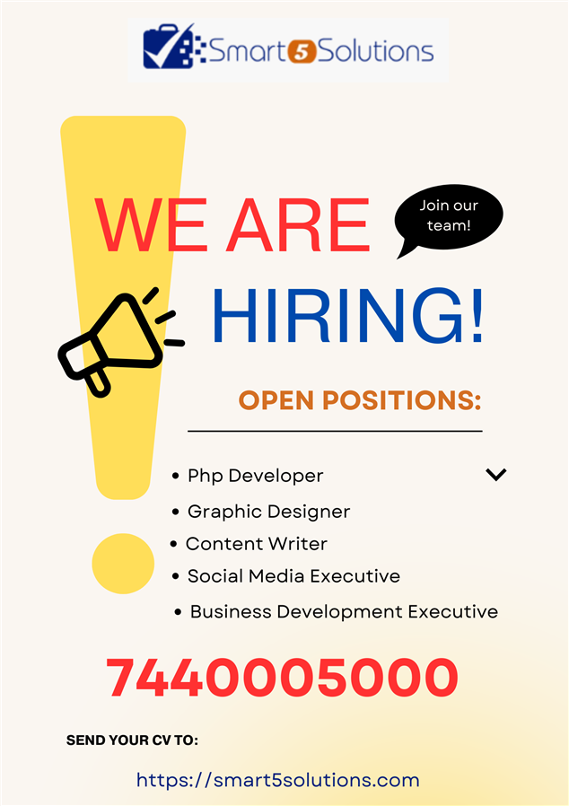 Smart5solutions is hiring PHP Developers for web development projects in Bhubaneshwar. The role involves working on dynamic websites, backend development, and database-driven applications using PHP.
