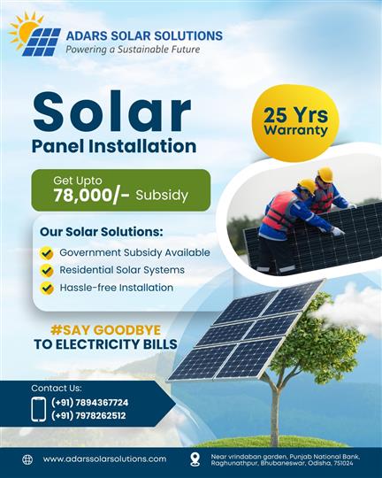 Solar Panel Price in Bhubaneswar is becoming more affordable as more people choose solar energy for their homes and businesses. With rising electricity bills, solar panels are now seen as a smart and long-term investment. Trusted providers like Adarssolarsolutions are helping customers understand pricing, installation, and benefits in a simple way.Solar Panel Subsidy in Bhubaneswar is now within reach for many households, making solar energy a practical choice. With the added benefit of the Solar Panel Subsidy In Bhubaneswar, the overall cost becomes even more affordable. Choosing the right provider and system ensures long-term savings and a cleaner future.