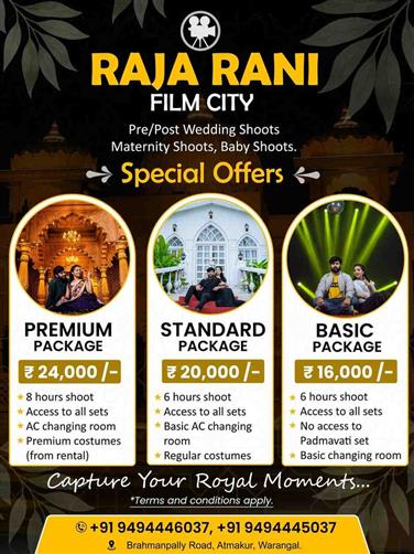 Raja Rani Film City, Warangal is one of the most popular destinations for baby birthday photoshoots and pre-wedding shoots in Telangana. With a wide range of beautifully designedoutdoor and indoorshooting sets, it provides the perfect backdrop for capturing your most special moments..